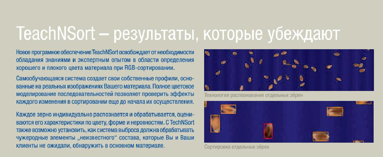 Вдосконалене програмне забезпечення ПРОЅ 900, оснащене у стандартній комплектації технологією розпізнавання форми і розміру, обробляє зображення кожного зерна. Недолік у виявленні квітів близьких до хорошого усувається завдяки розпізнаванню характеристик форми. Деформовані зерна також можуть бути отсортированны з придатного матеріалу.
