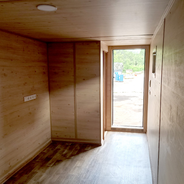 Контейнерна побутівка забезпечить комфорт у будь-яких погодних умовах завдяки утепленим стінам, стелі та підлозі. Обшитий ламінованим ДСП, з утепленням з мінеральної вати BauGut Universell товщиною 100 мм, що забезпечує відмінну тепло- та звукоізоляцію. Інтер'єр оздоблений стильним ламінованим ДСП (Бук Баварія), підлога утеплена мінеральною ватою та покрита OSB 20 мм з лінолеумом для додаткової зручності.