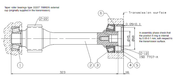- Помістіть кілька кілець (поз.5) між підшипником і ВОМ (поз.6), поєднуючи різну товщину, поки напрямне кільце ВОМ не виявиться всередині на 0,05-0,1 мм щодо трансмісії (це буде осьовий зазор для конічних роликових підшипників).